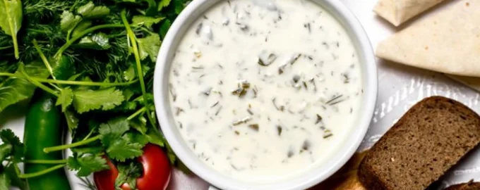 - Voeg Griekse yoghurt, 2 teentjes knoflook, citroensap, olijfolie, gehakte dille of munt en een beetje zout toe.