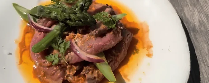 - Schik de plakjes rundvlees op een bord in de vorm van een roos, met de asperges ernaast. Giet de dressing erover, bestrooi met zout en voeg indien gewenst enkele plakjes ingemaakte rode ui toe.